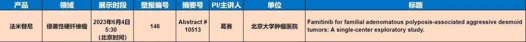 由北京大学肿瘤医院的葛赛教授作为主要研究者的法米替尼治疗家族性腺瘤性息肉病(FAP)相关的侵袭性硬纤维瘤(DT)的单中心探索性研究入选壁报讨论。