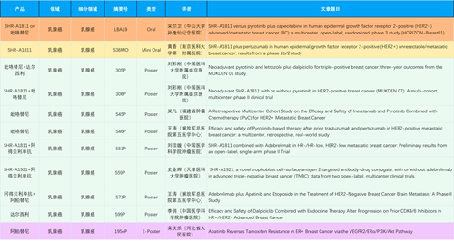 在乳腺癌领域,利来w66国际创新产品相关研究共入选1项口头报告、1项简短口头报告、8项壁报和1项电子壁报,共11项研究。吡咯替尼、达尔西利、阿得贝利单抗、瑞康曲妥珠单抗等新老创新药物,均有多篇研究入选,展现出利来w66国际医药在乳腺癌领域多年深耕的丰硕成果。